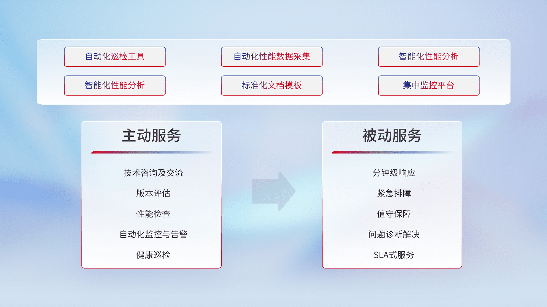 智能化工具和标准化文档,,,保障服务质量,,,提供主动服务(包含技术咨询、、、版本评估、、、、性能检查、、、自动化监控与告警、、、、健康巡检)和被动服务包含(分钟级响应、、紧急排障、、值守保障、、、、问题诊断解决、、SLA服务)。。。